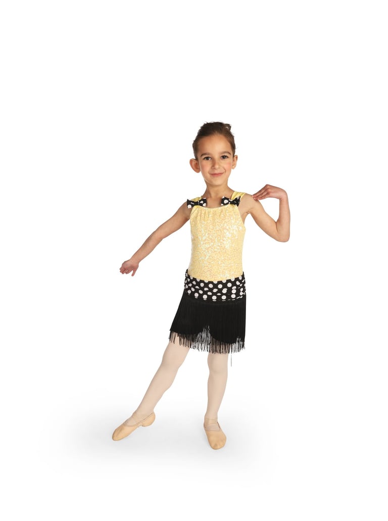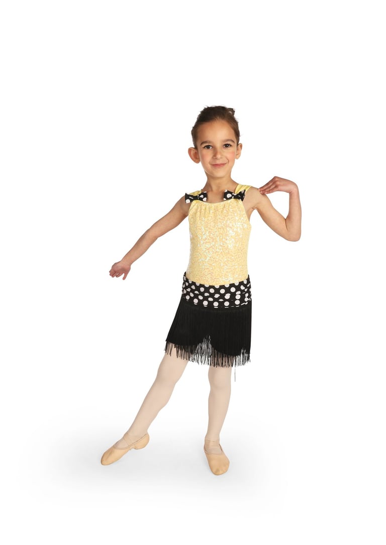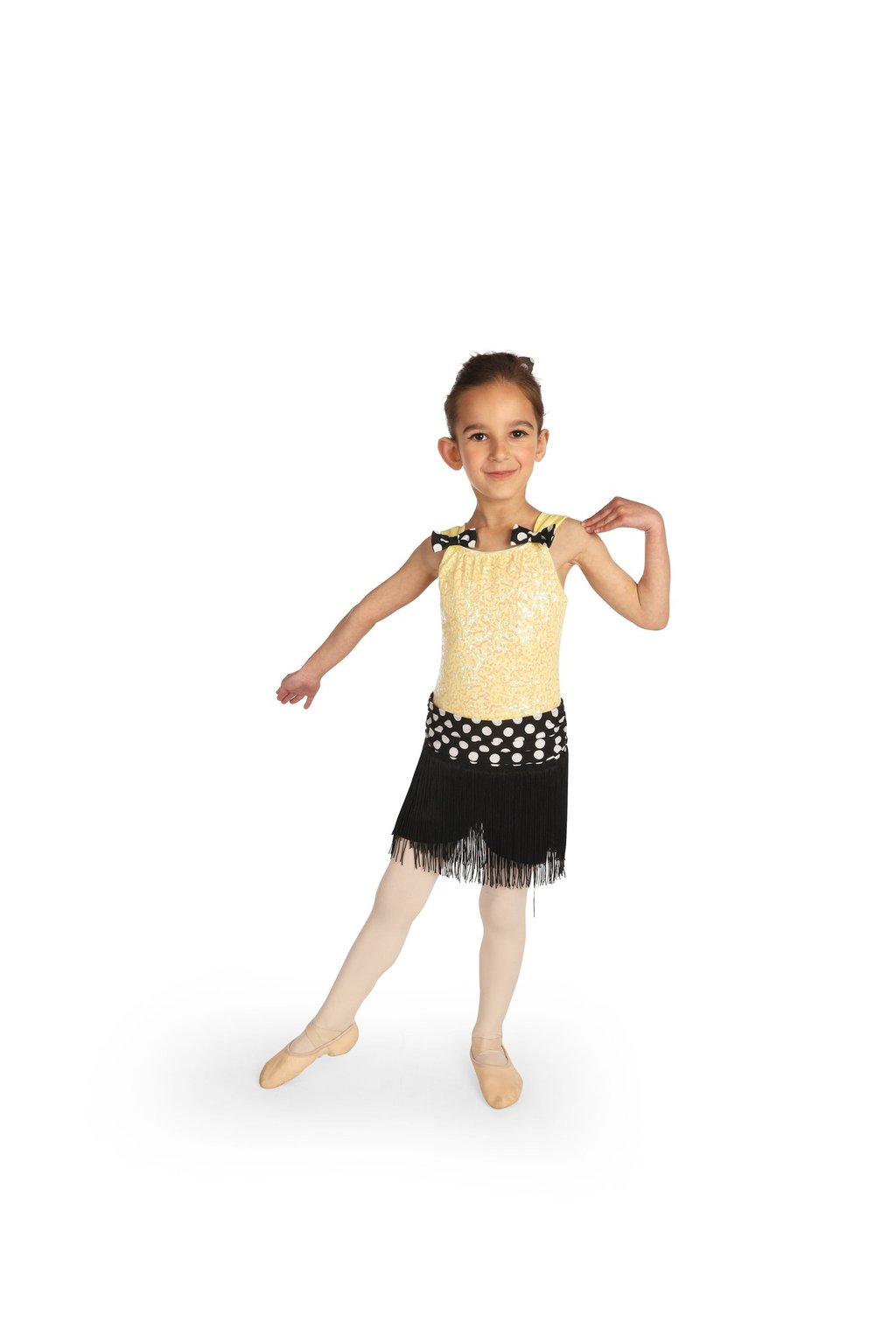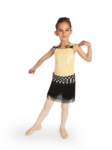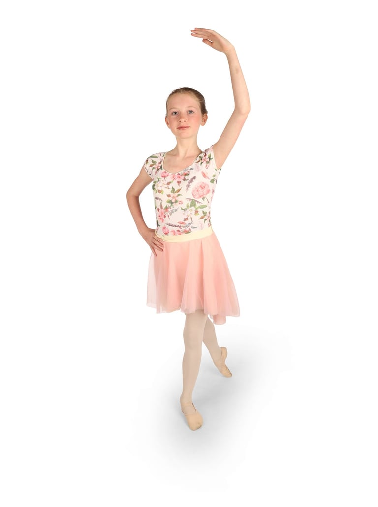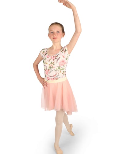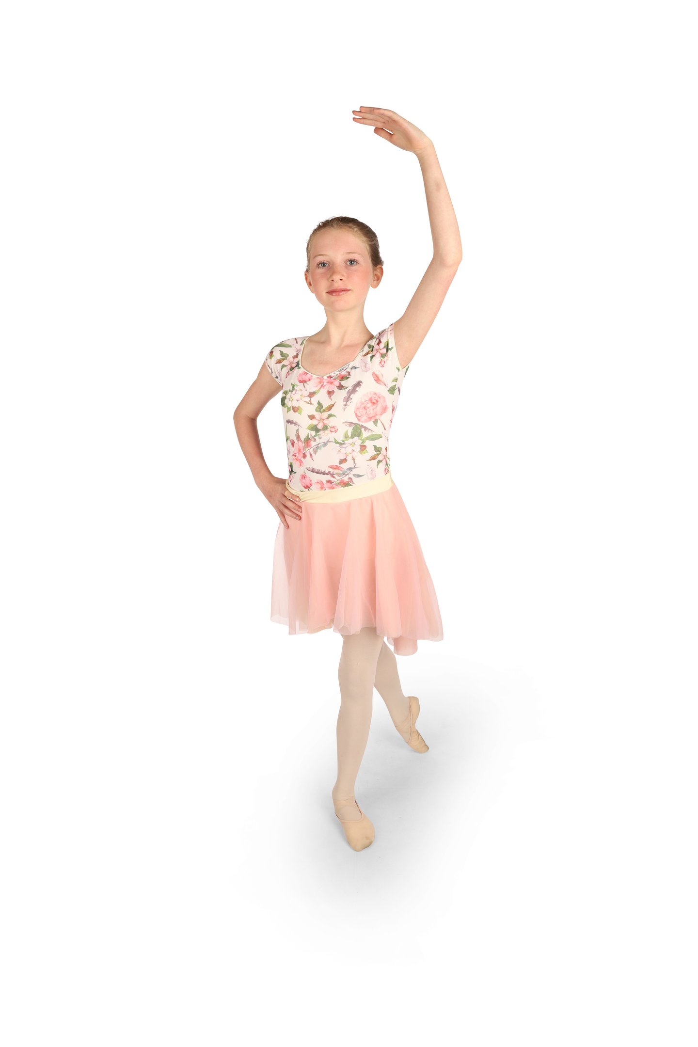 Girls: : Pale pink or white tights, bodysuit (any colour, any sleeve length), short circular skirt with elastic waistband, pink ballet slippers without strings, long hair tied up.