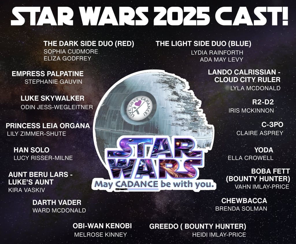 And now, the Force has spoken! We’re thrilled to announce the official cast for this year’s recital, a celebration of talent, creativity, and hard work. Get ready to see our dancers bring the galaxy to life in an unforgettable performance!