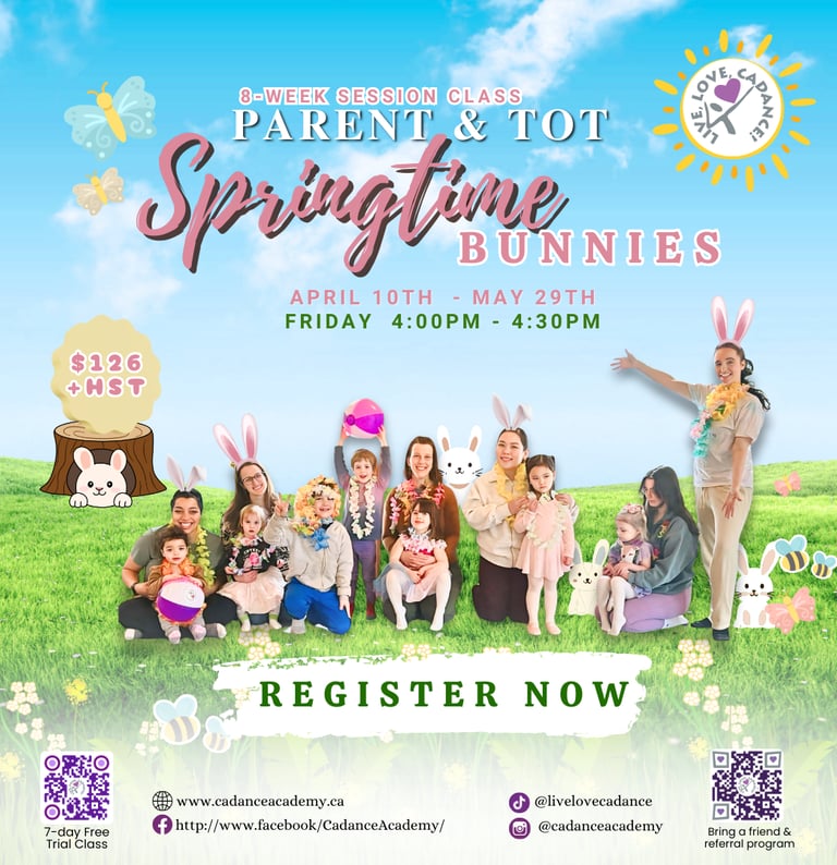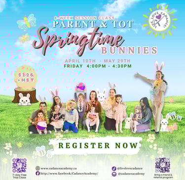 Join us for a fun spring & bunny–themed Parent and Tot class! Little ones will explore music and movement through playful activities in a safe, nurturing space—plus enjoy special bonding time with their grown-ups. A joyful start to your child’s dance journey!