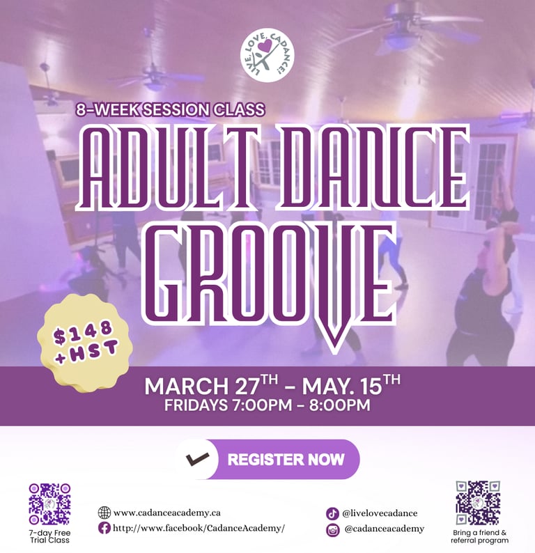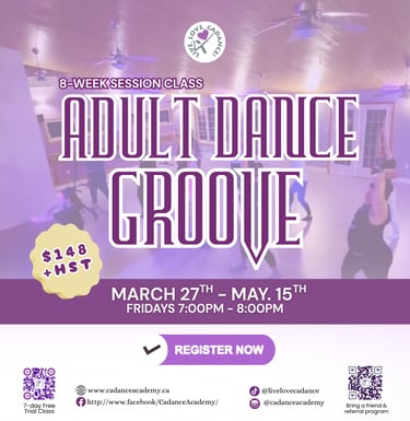 Adult Dance Groove is a high-energy fitness dance class that blends fun, movement, and a great workout. Enjoy easy-to-follow routines set to upbeat music while improving cardio, coordination, and confidence, all in a welcoming, feel-good environment. Perfect for all fitness levels!