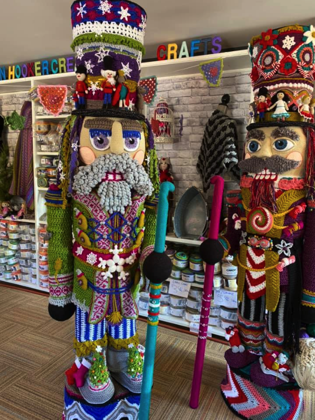 Cadance Academy’s Nutcracker production is excited to present two breathtaking, 12-foot-tall crochet Nutcrackers proudly displayed in our lobby for this year’s performances. These extraordinary creations were made by the skilled Crochet Crowd team, Michael Sellick, Daniel Zondervan, Kevin Price, and Karen Price, over three months of dedicated crafting.