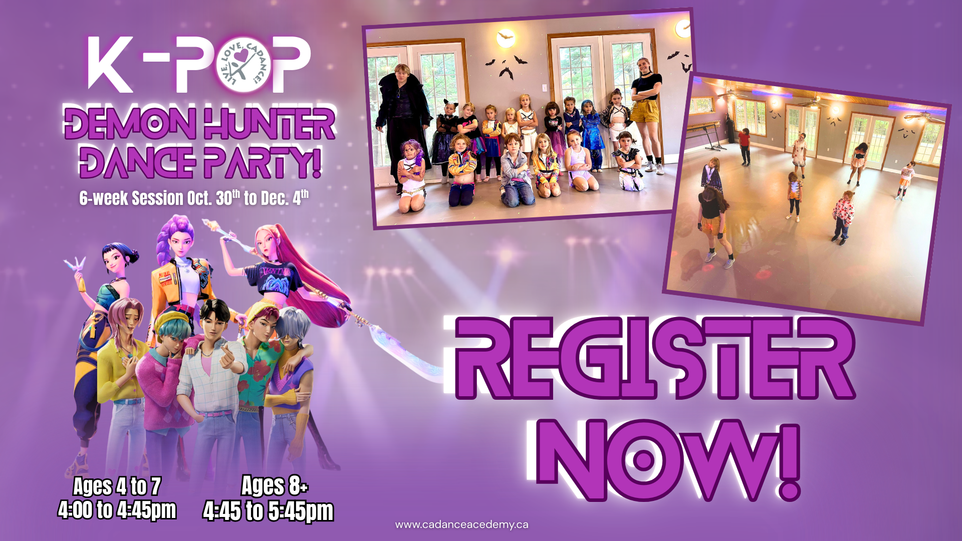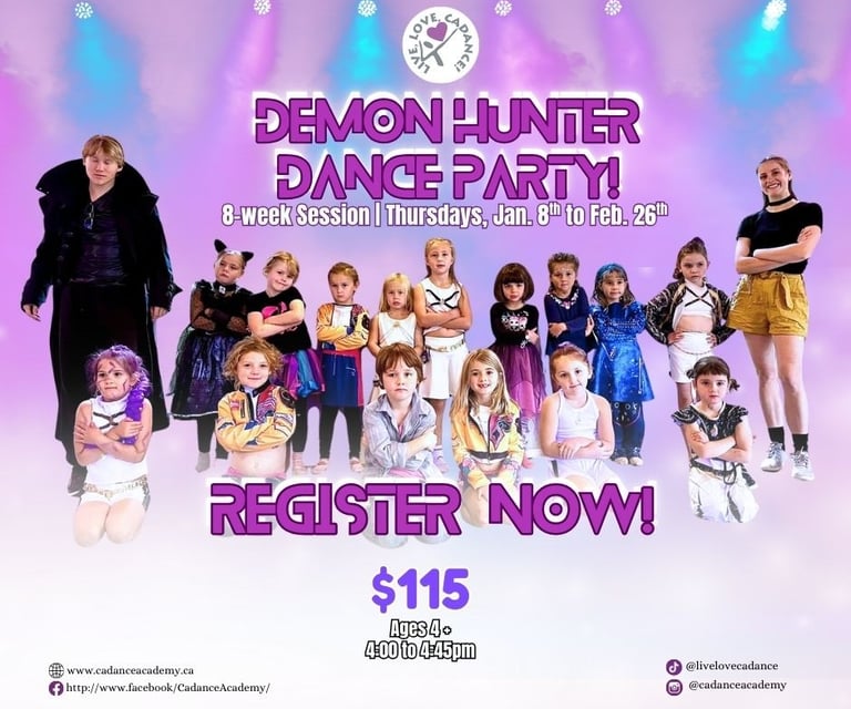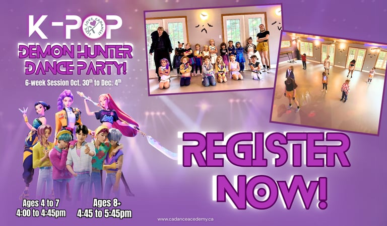K-Pop Demon Hunters Dance Party is a high-energy class inspired by K-Pop Demon Hunters, where dancers learn fun, age-appropriate K-pop choreography that builds rhythm, coordination, confidence, and performance skills. Classes are tailored by age group, welcoming both beginners and returning dancers in a supportive, upbeat environment.