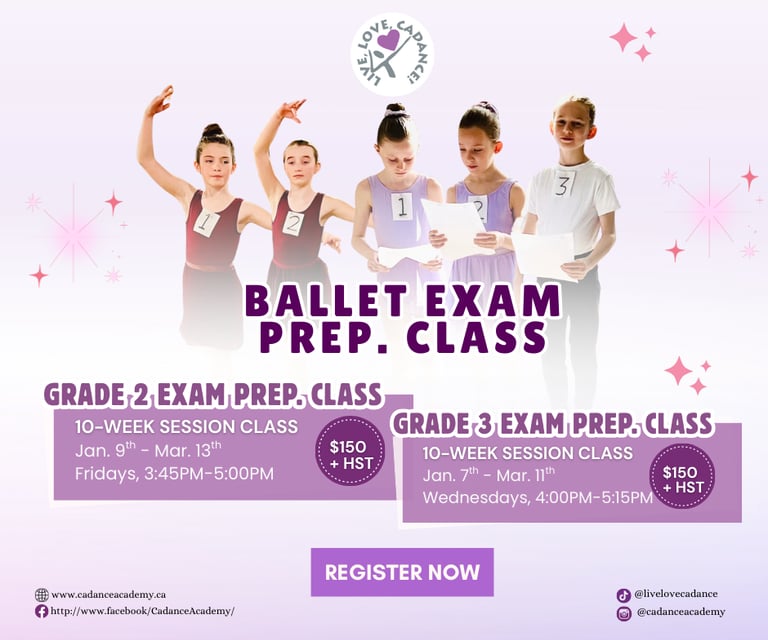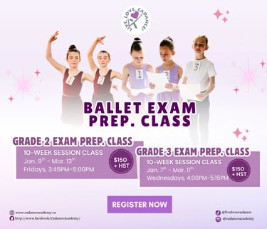 A required ballet exam preparation class for students working toward the Grade 2 or Grade 3 CDTA ballet exam. This class focuses on syllabus work, strengthening technique, musicality, and building confidence for exam readiness.