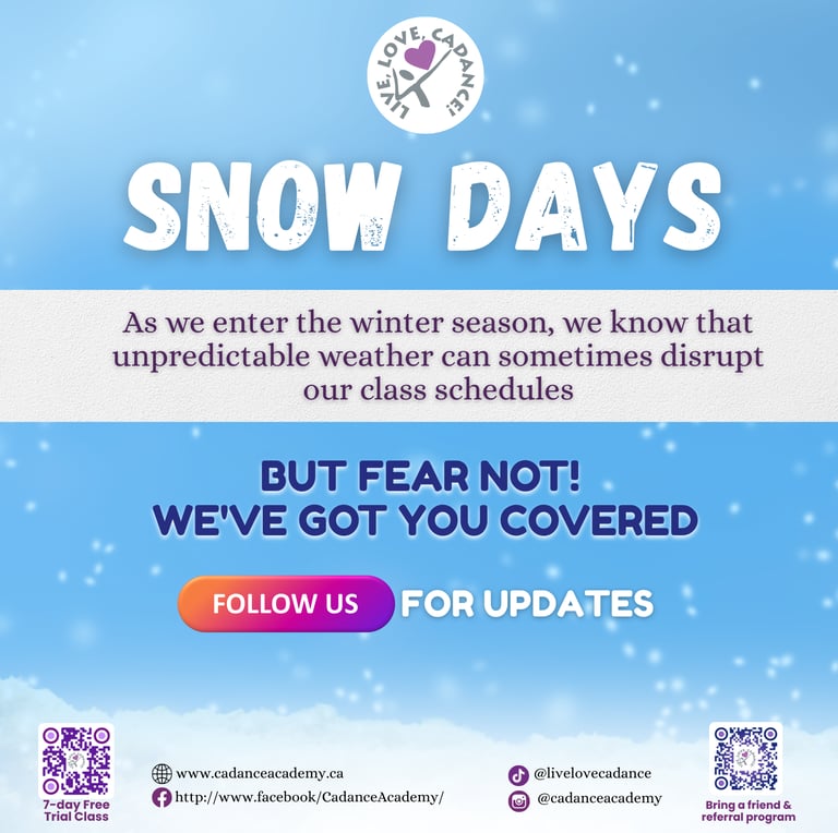 As we head into the winter season, unpredictable weather may occasionally affect our class schedule. Please be sure to check our Facebook and Instagram pages for the most up-to-date announcements regarding weather-related closures or schedule changes.