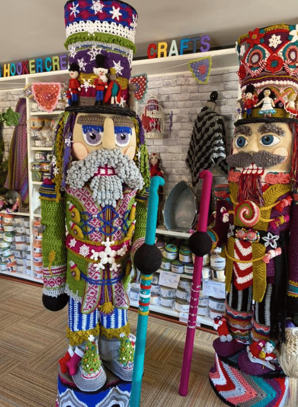Cadance Academy’s Nutcracker production is excited to present two breathtaking, 12-foot-tall crochet Nutcrackers proudly displayed in our lobby for this year’s performances. These extraordinary creations were made by the skilled Crochet Crowd team, Michael Sellick, Daniel Zondervan, Kevin Price, and Karen Price, over three months of dedicated crafting.