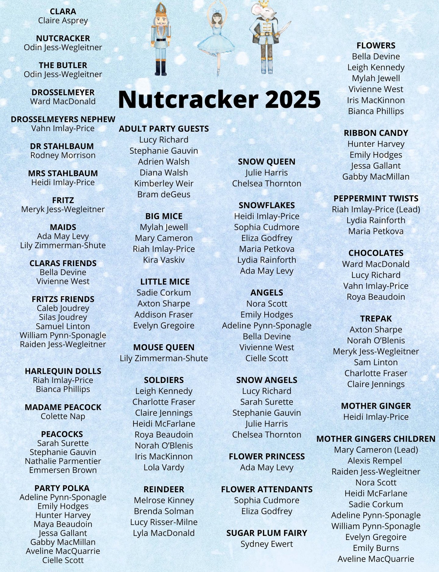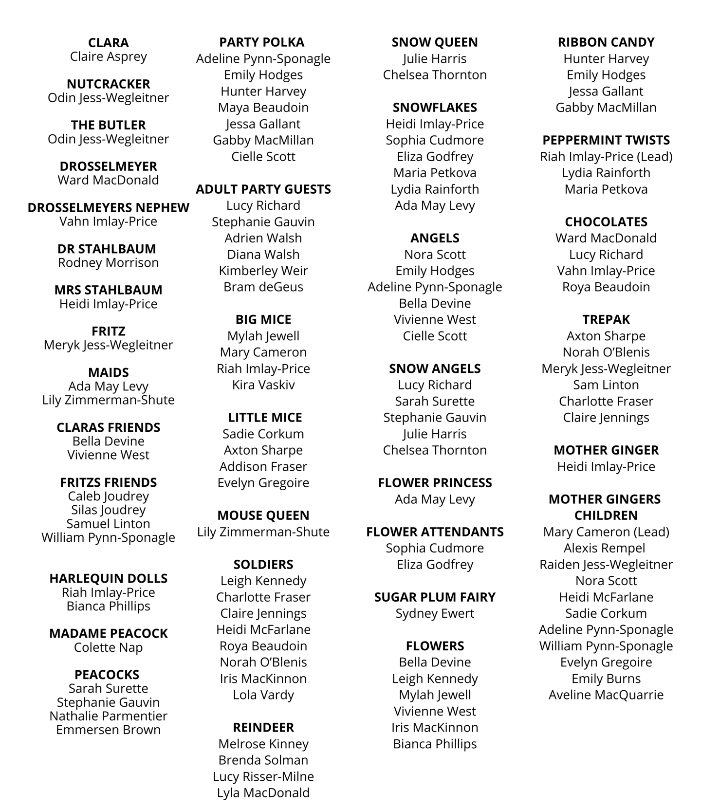 2:45 - 3:00 pm | Bow - The Bow starts at 2:45 p.m. and includes the following: performers: (Adult Waltz, Caleb Joudrey, Silas Joudrey, Cielle Scott, Aveline MacQuarrie, Clara, Nutcracker, and Drosselmeyer, Snow Queen, Mouse Queen,Soldier (Lola Vardy), Mouse (Kira Vaskiv) Reindeer, , Harlequin Dolls