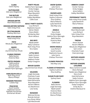 Party Scene (rehearsed twice): Clara, Clara’s Parents, Fritz, Fritz’s Friends, Clara’s Friends, Other Guests, Children’s Polka, Drosselmeyer, Harlequin Dolls, Nutcracker, Adult Waltz