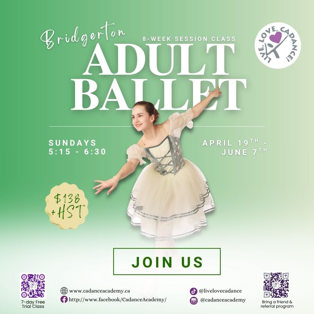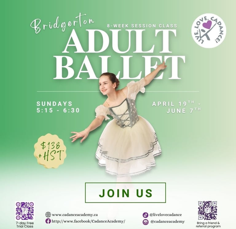 You are warmly invited to join a special class designed for adults seeking to move with grace while getting fit to the exquisite music of Bridgerton. Ballet is a wonderful way to sharpen your mind, enhance posture and balance, and connect with others who share a love for the art of dance.