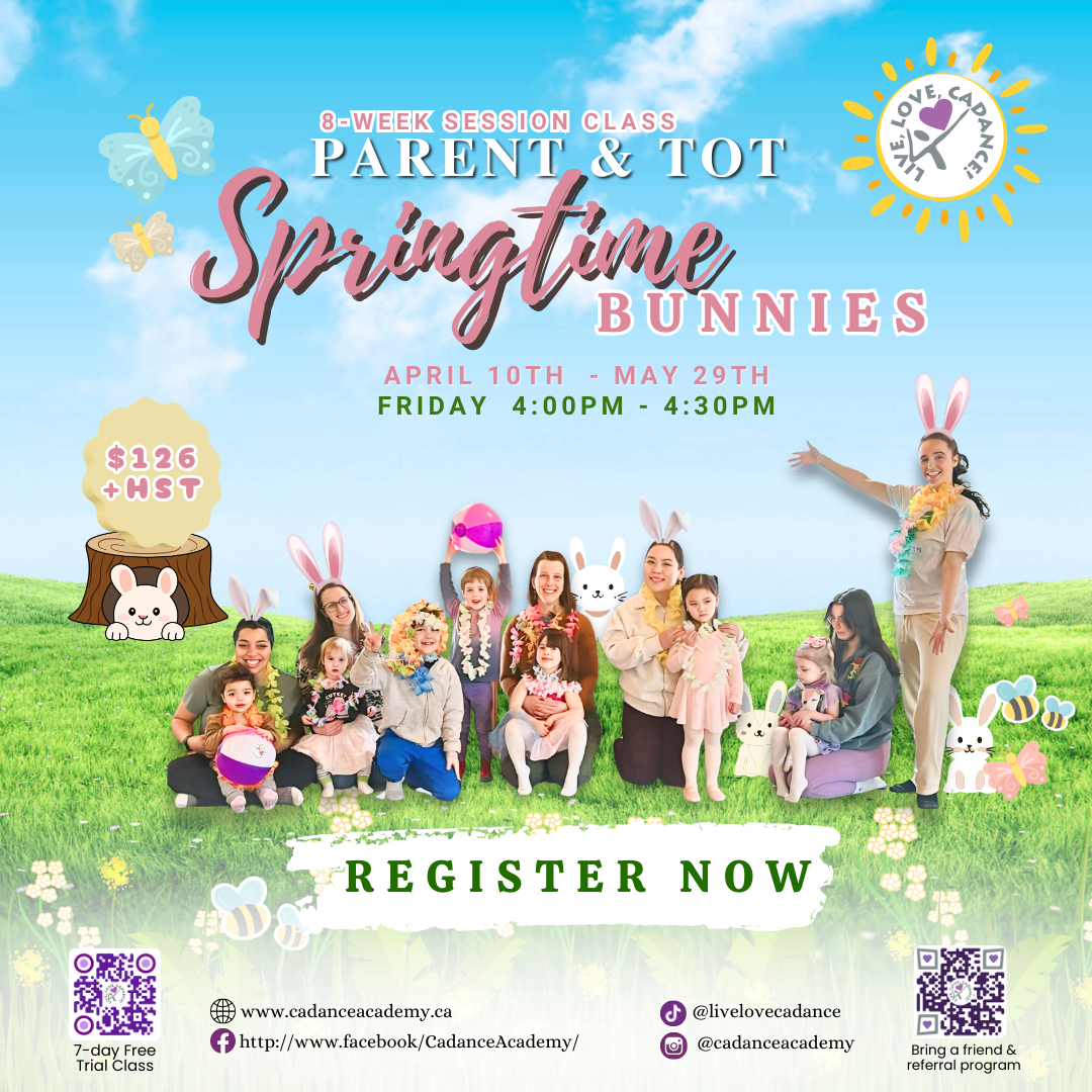 Join us for a fun spring & bunny–themed Parent and Tot class! Little ones will explore music and movement through playful activities in a safe, nurturing space—plus enjoy special bonding time with their grown-ups. A joyful start to your child’s dance journey!