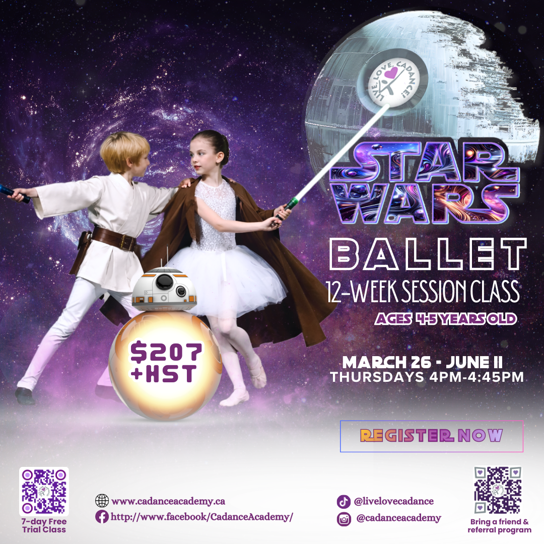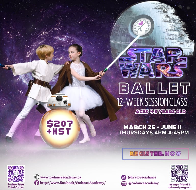 This beginner ballet class is specially designed for young dancers to explore basic dance skills and creative movement in a fun, supportive environment. Children will have the exciting opportunity to perform on stage alongside beloved characters like R2D2 and Princess Leia in our upcoming June dance show, "Star Wars." Whether your little one wants to simply enjoy dancing or dreams of shining under the spotlight, this class is the perfect place to start!