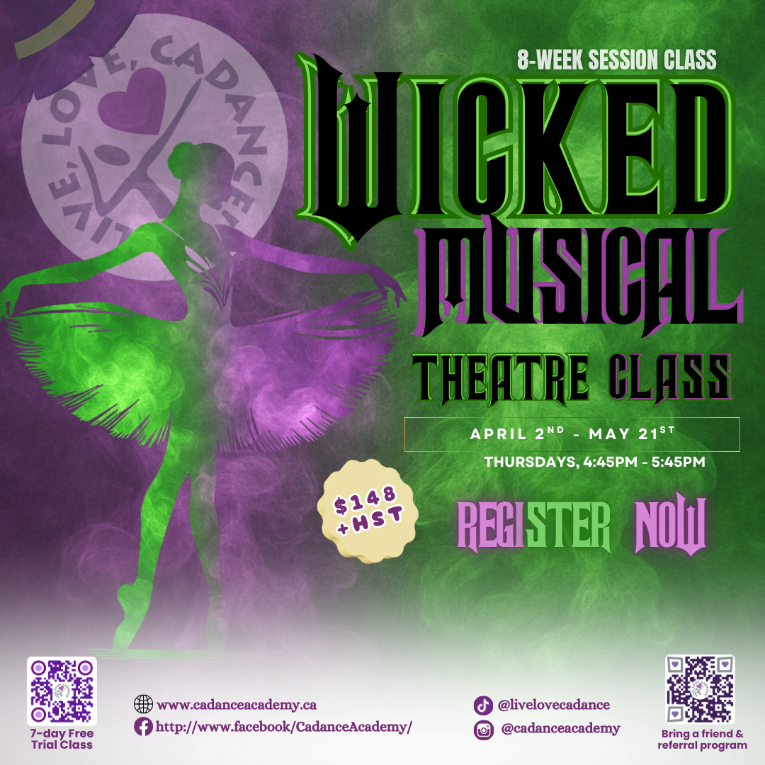 Dive into the magical world of musical theatre with our Wicked-themed class designed for kids aged 8 and up! In this fun and energetic class, students will explore singing, acting, and dancing inspired by the beloved story of Wicked. They will learn songs and scenes from the show, develop their performance skills, build confidence, and work as a team. Perfect for young performers who love music, storytelling, and bringing characters to life on stage. No prior experience needed—just bring your imagination and enthusiasm!
