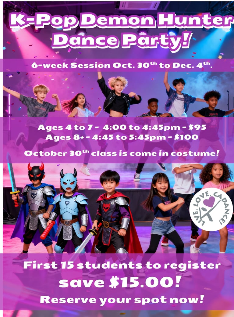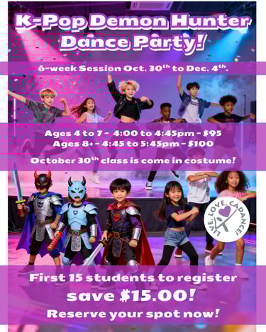 Get ready to move to the beat with our K-Pop Demon Hunters-inspired dance party! This exciting class brings the energy of K-pop to life through fun choreography, upbeat drills, and expressive performance—perfect for all experience levels.