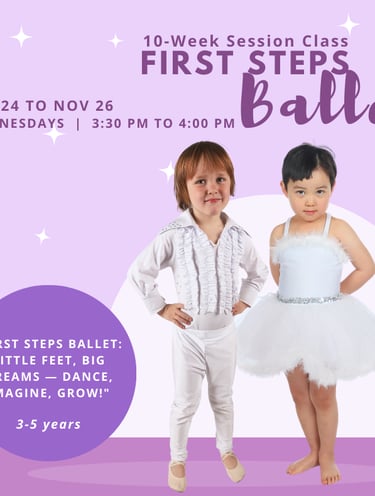 This fun 10-week session is a great way to introduce your child to the wonderful world of dance. First Steps Ballet is designed to improve coordination, encourage imagination, and develop physical and social skills in a developmentally appropriate environment. For three- to five-year-olds just beginning their dance journey, this session provides all the building blocks needed to establish a strong foundation for dance. Students learn through stories, creative movement, and age-appropriate instruction.